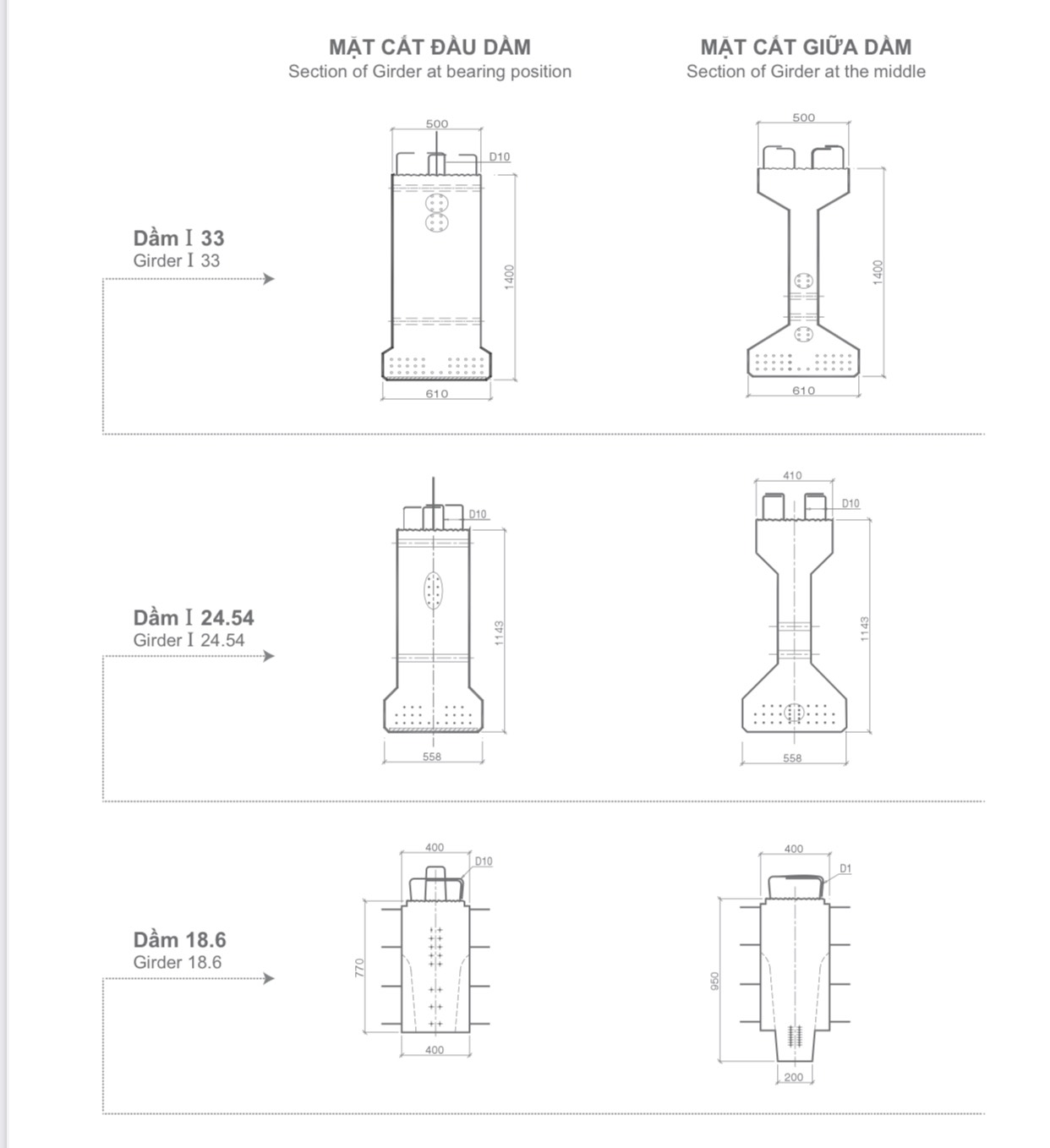 | 01 | Dầm / Girder I 33 | 33 | 610 | 1400 | 36,4 | H30 & XB80 – HL93 |
